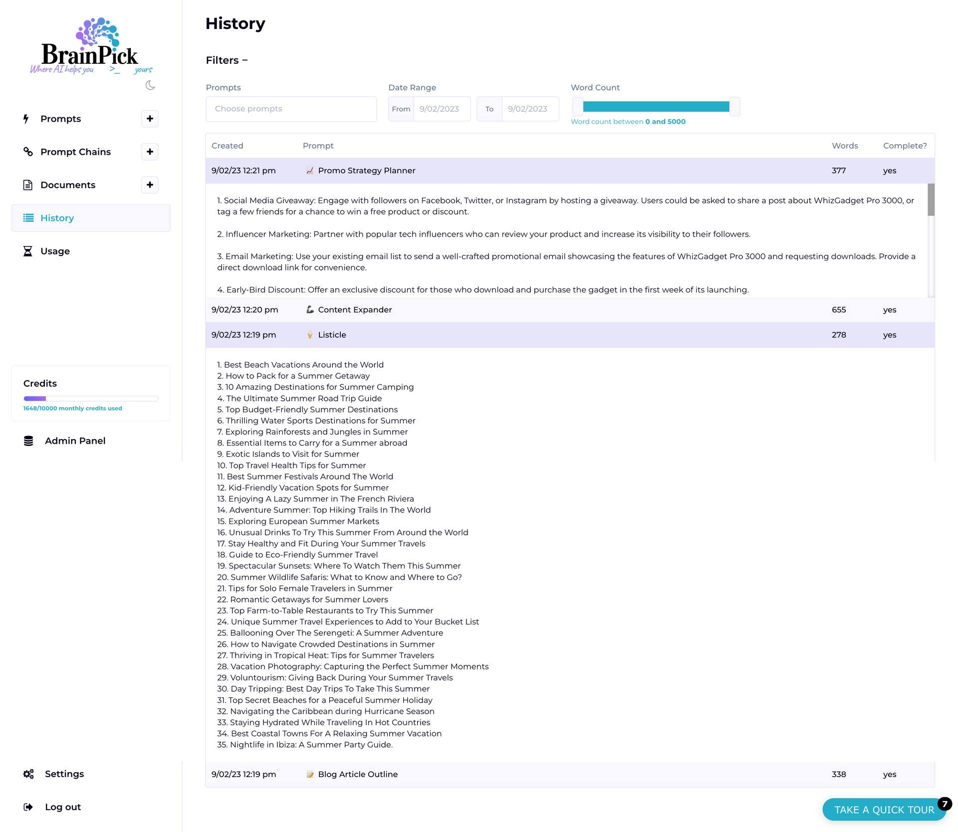 The History Log is a dedicated section within the Brain Pick platform that meticulously records every interaction users have with the AI. Whether it's a simple query, a complex prompt chain, or an AI-generated document, the History Log keeps track of it all.