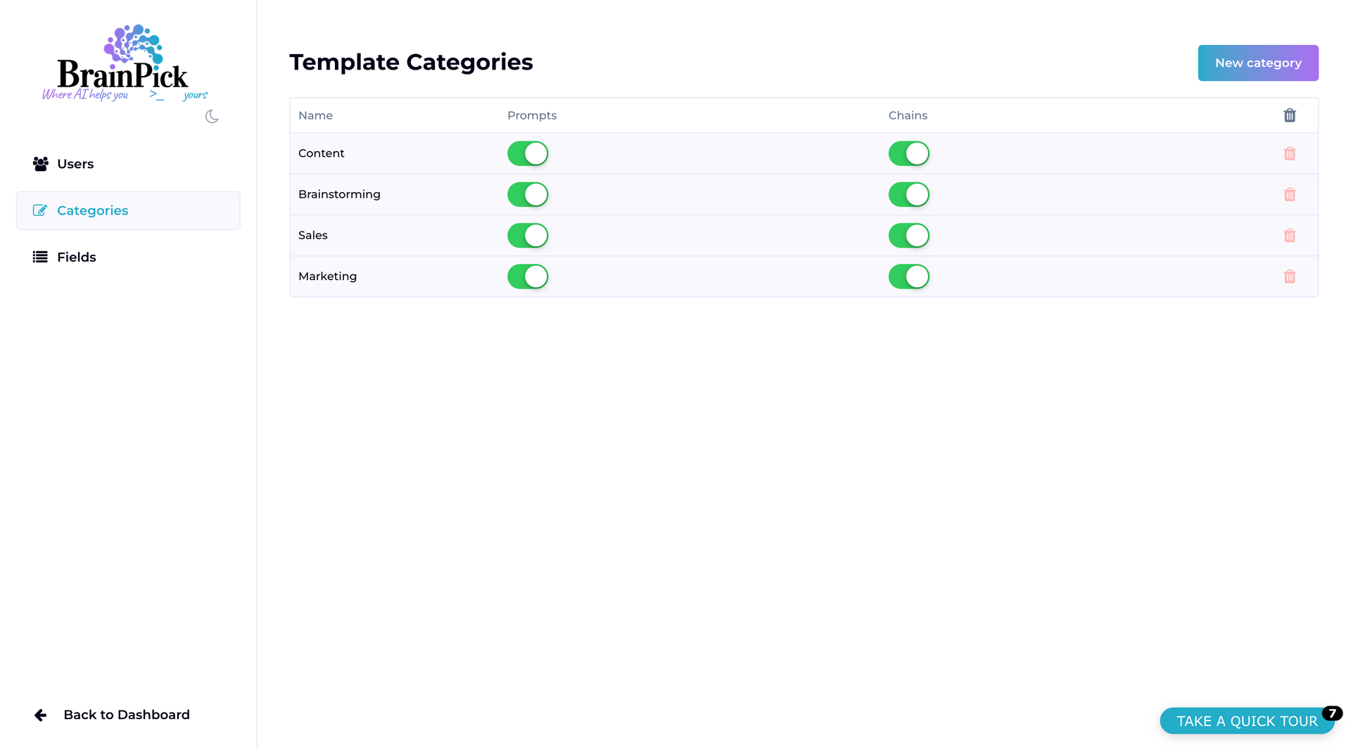 - Access the Category Section: Within Brain Pick's interface, navigate to the section dedicated to categories.